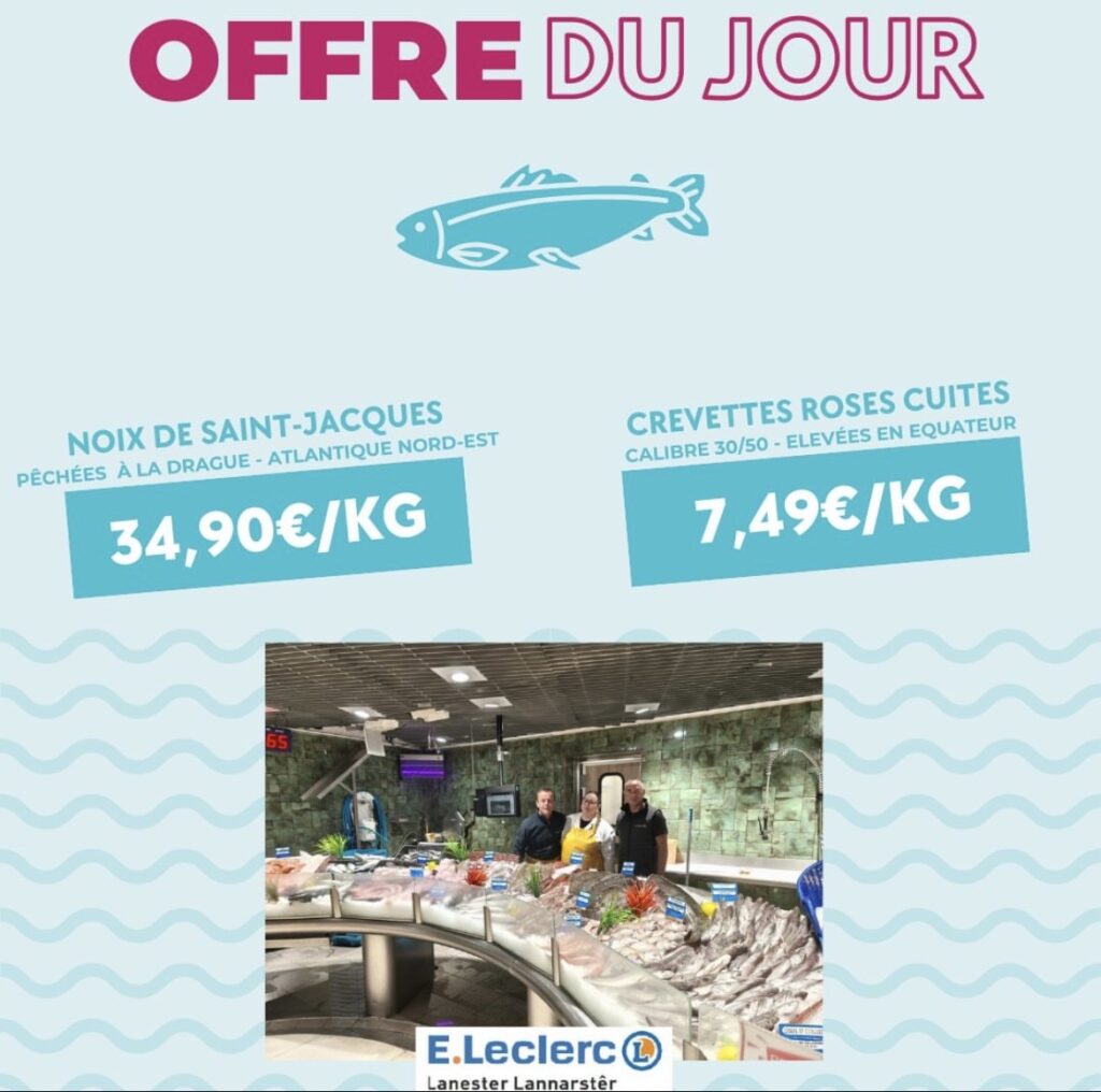 Mercredi 10 décembre, je me suis rendu au Leclerc Lanester pour représenter Top Atlantique en poissonnerie et vendre un maximum la promotion sur les noix de Saint-Jacques et les langoustines.